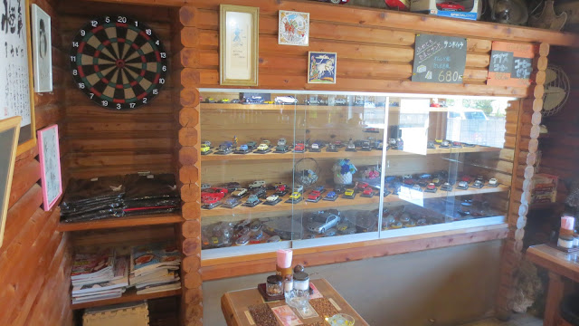 席数はカウンター席含めて10席程度でおーなーミニカーのコレクションも展示されています。